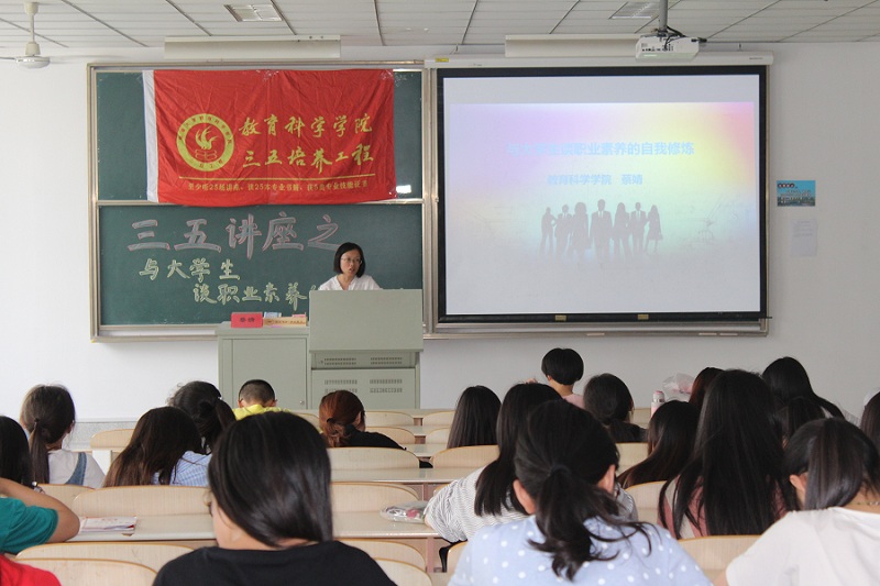 6月7日14:00,教育科学学院学习科研部在8-301举办了以“与大学生谈职业素养的自我修炼”为主题的讲座,此次讲座由教育科学学院蔡婧老师主讲,针对在校大学生职业生涯的规划相关情况进行指导讲解,重点分析如何提升自身职业素养。
