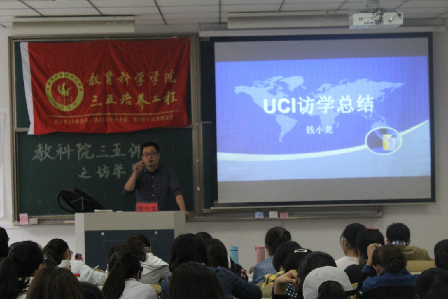 讲座开始,钱老师从UCI的教学地位出发,与同学们分享了留学的条件和所需的准备之后老师用丰富的图片描述了加州的校园环境、气候条件及公共设施等,并结合他在访学期间的美国课堂见闻,从教育设备和教育形式的两个角度反思了美国教育和中国教育的不同,详细地讲解了美国当下传统与现代相结合的教学设备和自由而不失严格的教育形式并提出“传统媒体不等于是没有价值的”。接着,钱老师结合个人经历,以举例的形式阐述了美国师生、同学、以及当地华侨和留学生之间和谐的人际关系,并穿插讲述了当地起居、饮食习惯等文化。最后,钱老师在座的同学展示了自己在访学期间取得的学术成果也同时表达了自己在美国时思念家乡的感情。
