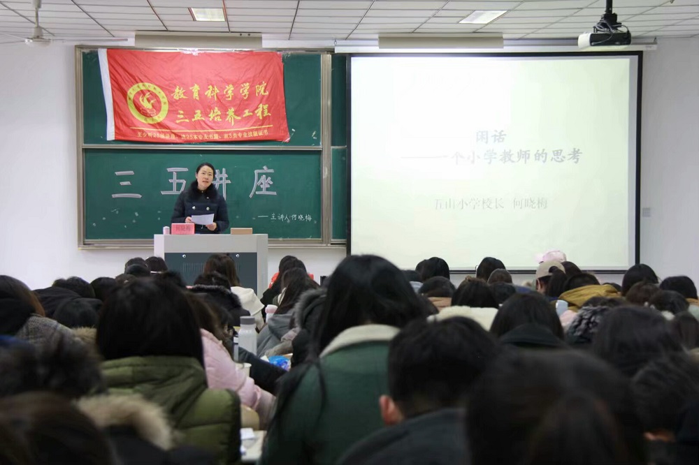 2018年3月21日下午,我院于8号教学楼208教室举办了题为“小学教育深思浅谈”的三五讲座。本次讲座邀请了五山小学校长何晓梅老师为主讲人,教科院160余名小学教育专业学生到场听讲。