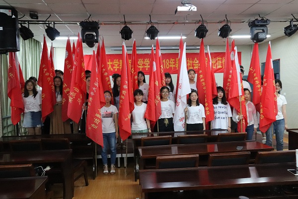 出征仪式由院团委副书记顾佳言同学主持。院团委书记魏琳老师简要阐述了开展社会实践的意义,并介绍了2018年暑期社会实践前期筹备工作。接着,赵敬龙老师宣读了校级重点小分队名单,与会的领导和老师向我院成立的23个暑期社会实践小分队代表授旗,接过手中的旗帜,各实践小分队挥舞旗帜,信心满满,整装待发。张银莹同学代表暑期社会实践学生发言,号召同学们以“天下兴亡,匹夫有责” 的使命感,以“敢为天下先”的责任感,在暑假社会实践中铸就亮丽的青春,书写灿烂的篇章。