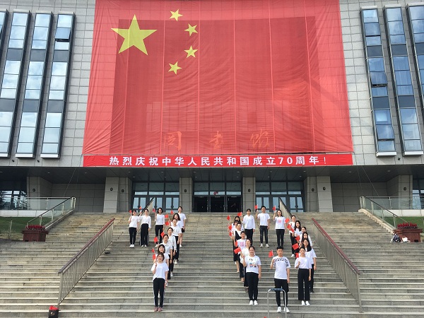 学前专业的研究生身穿白色T恤衫,手持鲜艳的小国旗,在图书馆南广场的台阶上,整齐的排列成70两个数字,以此表达对新中国成立70周年的美好祝福。