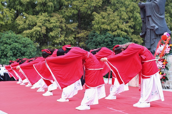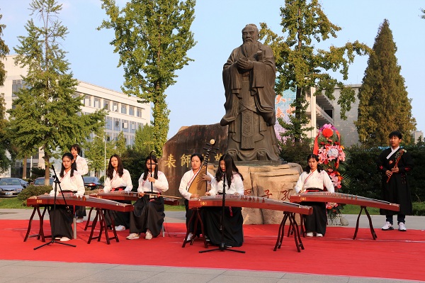礼仪队进行了精彩的古代礼仪展示,然后行师礼,先向孔子像行大礼,而后向各位老师行礼,诠释了“礼”这一先贤孔子的核心思想。学院的徵羽民乐艺术社带来的乐器合奏演绎了古典民族音乐的魅力,彰显了我国博大精深的古典文化。在肃穆的氛围中,教师代表濮海慧老师高声宣读祭文,歌颂缅怀的孔子绝世功绩、伟大思想和高尚人格。