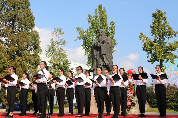 朱丹代表学院在祭孔仪式上致辞。她强调:孔子被历朝历代奉为“文圣”,他所创立的儒家文化,为中国的文化教育立下了不朽功勋。作为一个以教师教育为特色,以培养师范生为主体的学院,理应继承学校师范教育的传统,扛起“传承传统文化薪火,重塑高尚师德灵魂”的大旗。她希望2019级的师范生们谨记先圣遗训,一要学习他的仁爱情怀,用高尚的师德熏陶学生,用渊博的知识丰富学生,用高雅的言行影响学生;二要学习他的使命意识和进取精神,要自觉肩负起时代赋予我们的使命,砥砺品格,勤思善学,提高教书育人的本领,自觉投入到祖国的教育事业中去;三要学习他的学习精神和内省精神,以孔子作为人格完善的榜样,树立终身学习的意识,将国学精要与时代精神、育人事业紧密结合,提升自身道德修养,早日成长为国家的栋梁之才。