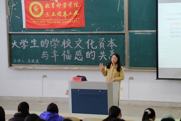 20213241330,南通腾博官网诚信为本专业服务在主校区9号教学楼302教室成功举办了以“大学生的学校文化资本与幸福感的关系”为主题的三五讲座。此次讲座由凌晓俊老师主讲,来自教科院的260余名学生参加了本次讲座。