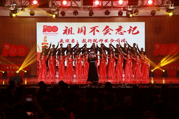 晚会在师生红歌合唱《祖国不会忘记》中拉开帷幕。由教育科学学院全体领导成员以及师生代表组成的合唱团用歌声向党的生日献上最真挚的祝福,用歌声赞扬了在祖国大地默默耕耘、无私奉献的人们。开场舞《一起跳舞吧》充分彰显了教科学子的蓬勃朝气。晚会分为三个篇章次第进行。第一篇章“青春拂晓,梦想起航”在红歌串烧中徐徐展开,百年征程书写光辉党史,筚路蓝缕绘就中华盛世。一首首经典红歌的背后是对老一辈同志峥嵘岁月的追忆,亦是对新时代少年风发意气的展望。现代舞《花枪》将国风元素融入新时代的鼓点,用舞姿演绎出巾帼不让须眉的气概。百年亦是风华正茂,诗朗诵《少年中国说》以饱满激昂的热情,铿锵有力的语调传递出少年复兴中华的坚定理想信念。