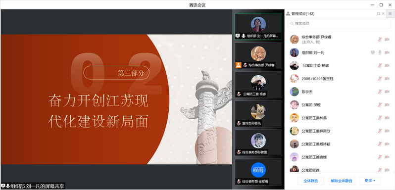 此次会议带领团学学员积极学习党的新精神,认识江苏省发展的现状,并了解未来的发展方向。作为团学的一员,定要不负中央厚望,不负人民重托,不负时代韶华,坚决扛起三大光荣使命,不断续写新的华章!
