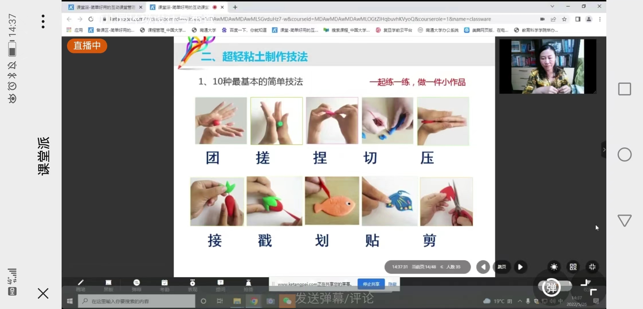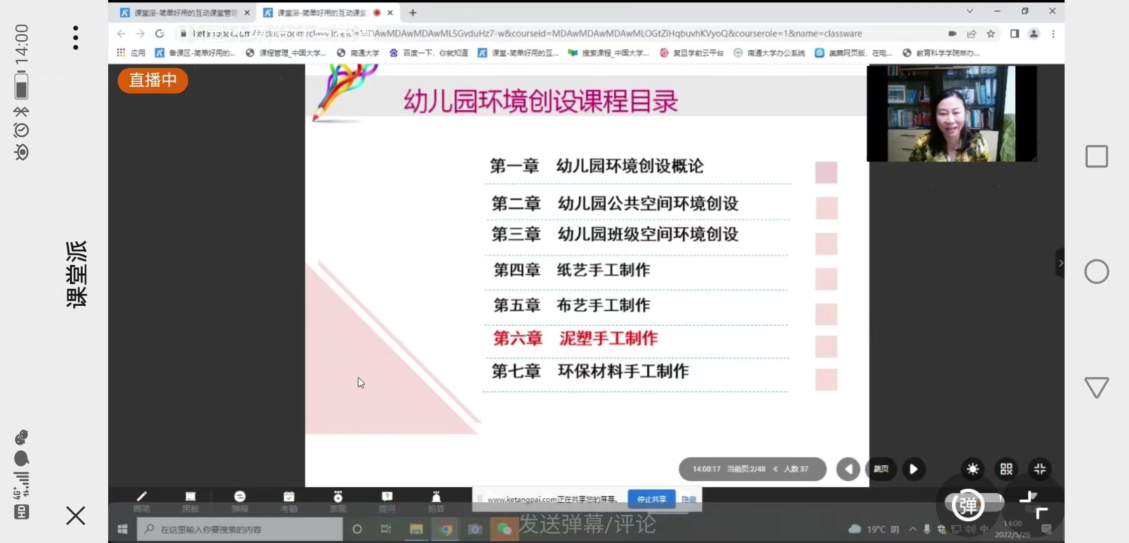 2022526日下午,教育科学学院学前教育系袁洪群老师在课堂派讲授了《幼儿园环境设计与布置》中的《泥塑手工制作,学前师范191全体学生准时参课,学前教育系吉兆麟主任及院系多名教师线上观摩了此课程。