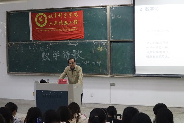2022年11月2日下午,我院在九号楼202教室举办了三五培养工程之数学诗歌活动,本次活动的主讲人是教育科学学院徐伯华副教授,260位学生聆听了讲座。