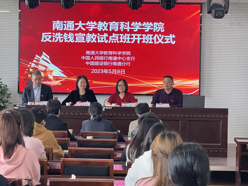5月8日下午,教育科学学院携手中国人民银行南通市中心支行、中国建设银行南通分行举行反洗钱宣教进校园活动,并举行反洗钱宣教试点班开班典礼。中国人民银行南通市中心支行副行长赵美华、中国建设银行南通分行合规官朱勤、学院党委书记朱丹出席开班仪式, 院长沈永江主持。