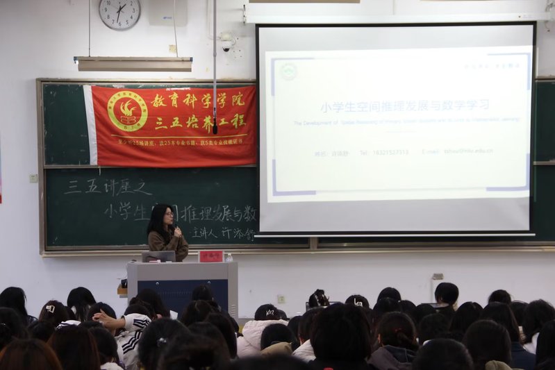 1122日下午,我院于四号教学楼107室举办以小学生空间推理发展与数学学习为主题的三五讲座。讲座由许添舒老师担任主讲人,我院260余名同学参加了本次讲座。