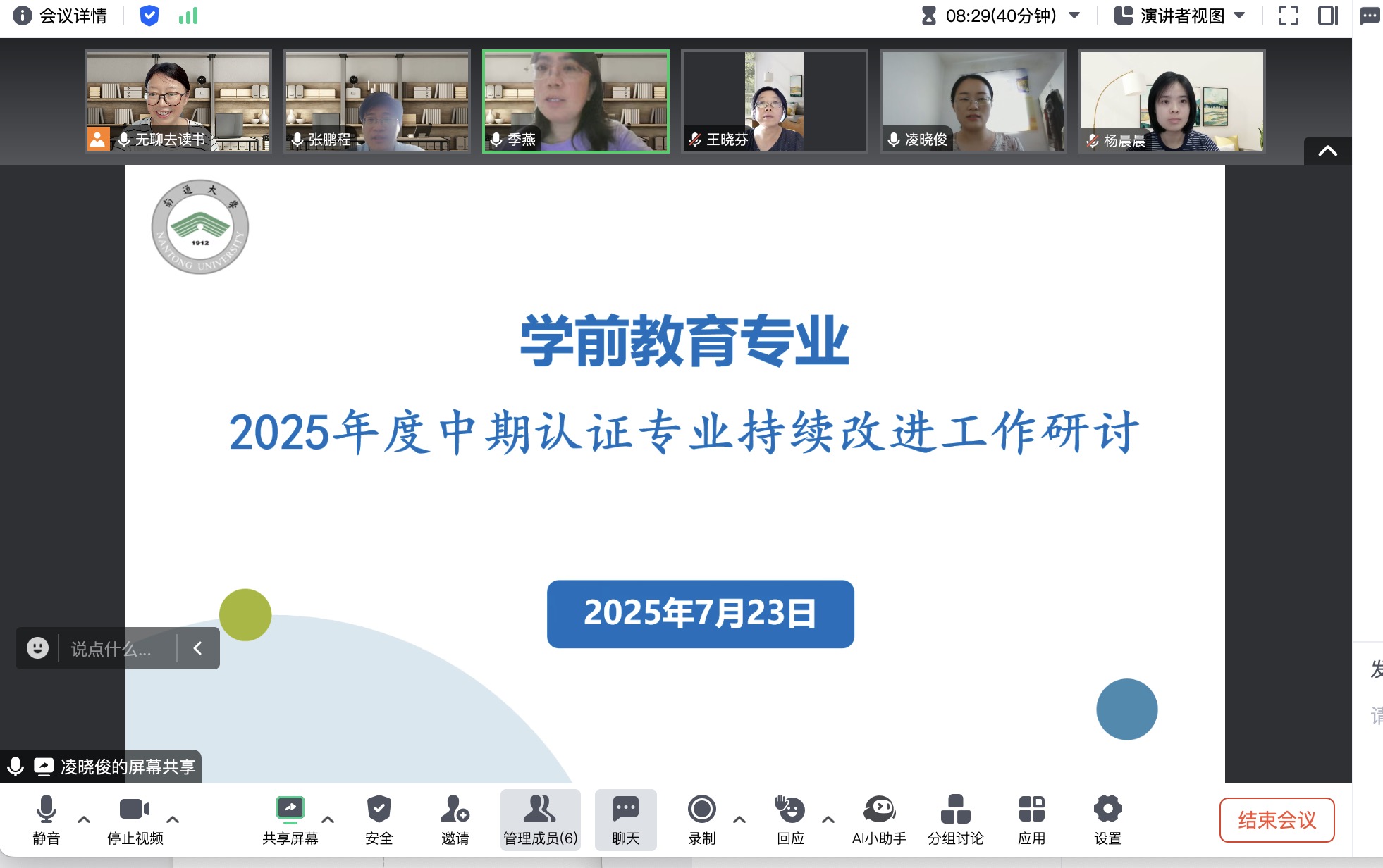 7月23日,我院召开学前教育专业认证第二级中期持续改进及新一轮专业认证工作研讨会。教育科学学院教学院长张鹏程教授、学前专业学科带头人王晓芬教授、学前专业负责人钱慧教授、系支部书记季燕副教授、学前系主任凌晓俊、副主任杨晨晨等人员出席此次线上会议。会议围绕两大议题展开:一是学前教育专业认证第二级终期总结工作,二是部署新一轮专业认证筹备工作。