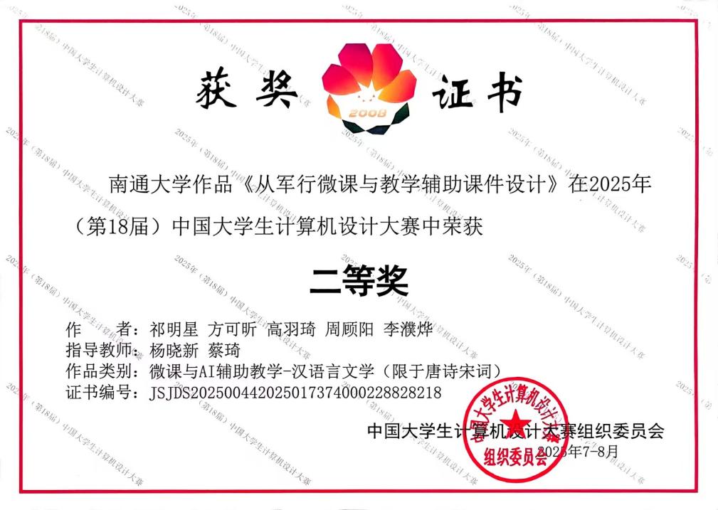 7252025年(第18届)中国大学生计算机设计大赛在南京大学落下帷幕。由杨晓新、蔡琦两位老师指导的祁明星、方可昕、高羽琦、周顾阳、李濮烨5位同学组队参赛作品《从军行微课与教学辅助课件设计项目》荣获该项大赛二等奖。