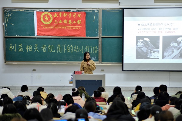 12月3日下午,南通腾博官网诚信为本专业服务在9号教学楼302教室成功举办了以“利益相关者视角下的幼小衔接”为主题的三五讲座,此次讲座的主讲老师是杨晨晨老师,来自教科院的260余名学生参加了本次讲座。