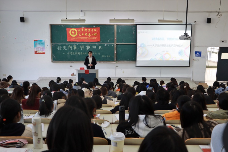 2021年11月10日,南通腾博官网诚信为本专业服务在9号教学楼303教室举办了以“赶走阴霾,拥抱阳光——大学生抑郁情绪的识别与应对”为主题的三五讲座。此次讲座由张恒老师主讲,教科院260余名学生参加。