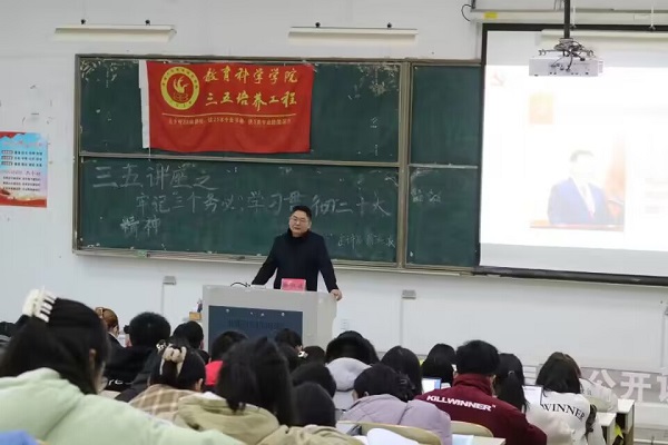2022129日,教育科学学院于9号楼202号教室举办了以“牢记‘三个务必,学习贯彻二十大精神”为主题的三五讲座,南通腾博官网诚信为本专业服务党委副书记、副院长徐红波担任主讲人。教育科学学院150余名同学参加了此次讲座。