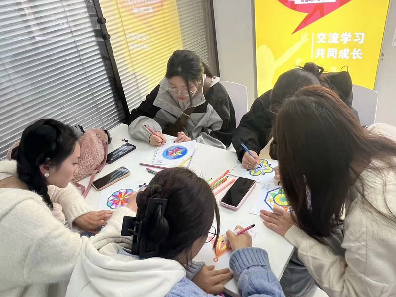在本次活动中,同学们选择自己喜欢的曼陀罗图案,根据自己的心情选择色彩来为曼陀罗进行涂色。涂色完成后,依次分享自己作品中所要分享和表达的情感,比如冷静、忧愁、愉悦等。通过绘画过程中的思考和感受,同学们可以更好地了解自己的内心世界和情感状态,并在此基础上调整自己的情绪和行为。