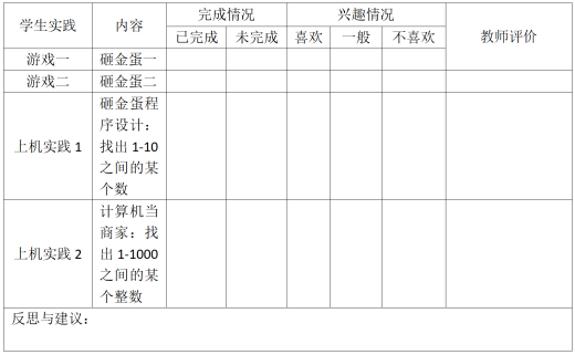 活动 | 游戏升级:共有9个金蛋,商家将金蛋按照其中的数字大小从小到大排列。大家采取怎样的方法能快速的砸出目标数字呢? 学生两两合作,分别扮演商家与顾客。商家选择目标数,顾客猜测目标数。每次猜测后,商家告知顾客所砸出的数字“高了”还是“低了”,记录每次砸出的数字。 记录每次砸出的数字,并用流程图的方式总结砸金蛋方法。 | 小组合作,积极思考如何快速砸出目标数字。按小组画出顾客猜出正确价格的步骤 | 体会二分查找解决问题的步骤、分治思想。 | 3 | ||||||||||||||||||||||||||||||||||||||||||||||||||||||||||||||||