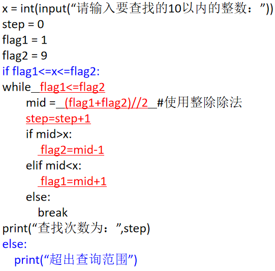 【动画演示】 用动画演示flag1、flag2、mid变化过程 | 学生观看动画体会二分查找过程。回答相关问题。 | 将抽象的编程概念通过动画变的可视化,加深学生对二分查找的理解程度。 | 2 | |||||||||||||||||||||||||||||||||||||||||||||||||||||||||||||||||