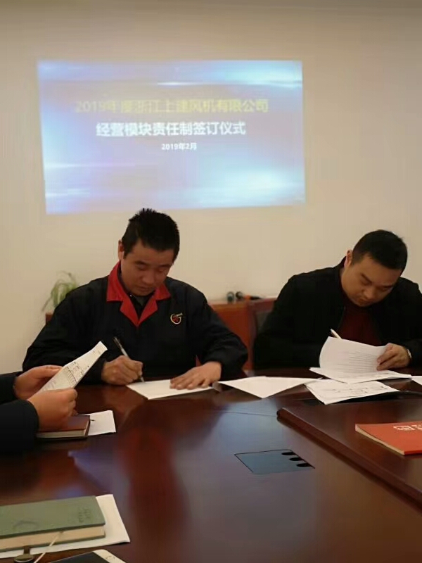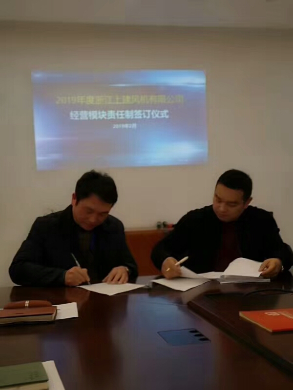 2019年2月28日,浙江腾博官网诚信为本专业服务风机有限公司经营目标责任状签订仪式在公司1号会议室举行。公司总经理童海标、各经营部门负责人、职能部门负责人参加签订仪式。