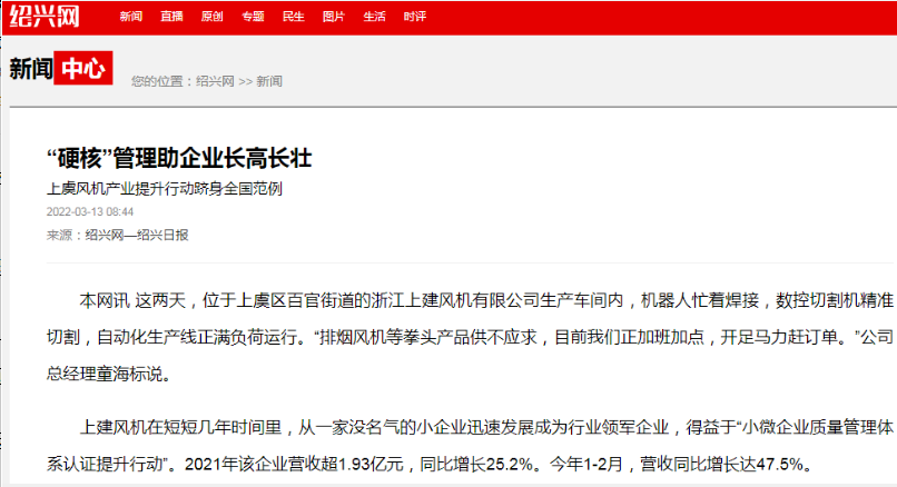浙江腾博官网诚信为本专业服务风机有限公司在这个政策下在短短几年时间里,从一家没名气的小企业迅速发展成为行业领军企业, 2021年该企业营收超1.93亿元,同比增长25.2%。今年1-2月,营收同比增长达47.5%。