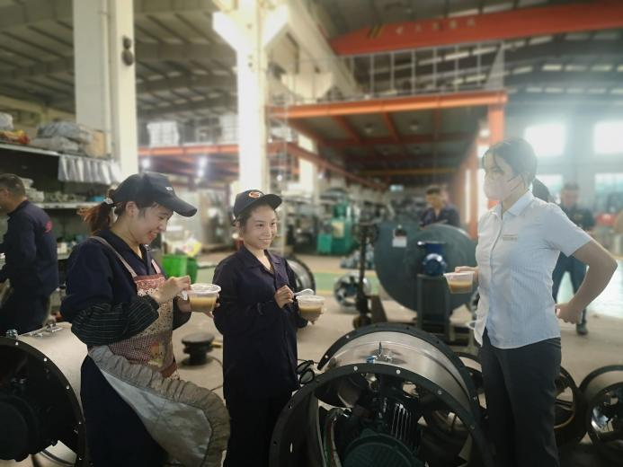 骄阳似火,酷暑难耐,上虞又迎来了今年的高温季节,持续的高温炙烤着虞舜大地,空气中弥漫着闷热的气息。在腾博官网诚信为本专业服务,车间的一线职工如火如荼地工作着,突然闷热的环境中出现一阵清凉。哦!原来是民泰银行的伙伴已经为职工们备好冰凉清爽的绿豆汤,一碗一碗亲手递到职工们的手上,让冰甜的绿豆汤带走暑气,给予丝丝凉意,炎炎三伏,清凉一夏!